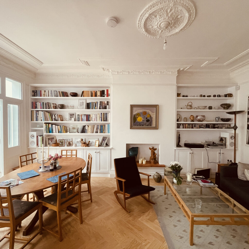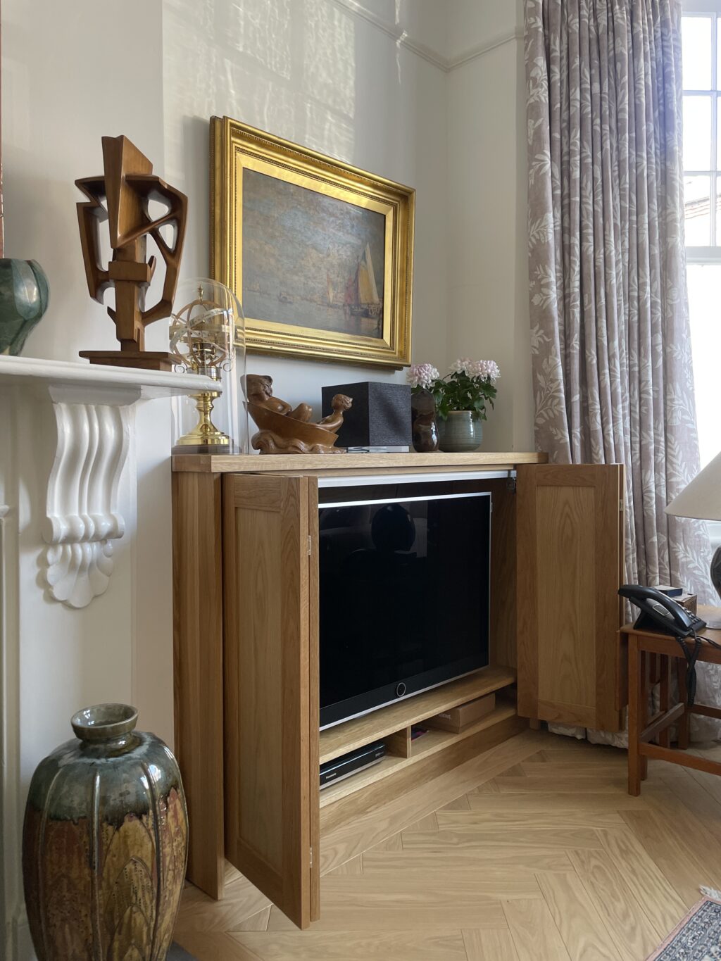 Studio VK also designed, built and fitted a large shelving unit to either side of the chimney breast in the dining room, and a solid Oak TV unit to the front room – concealing the TV when not in use.